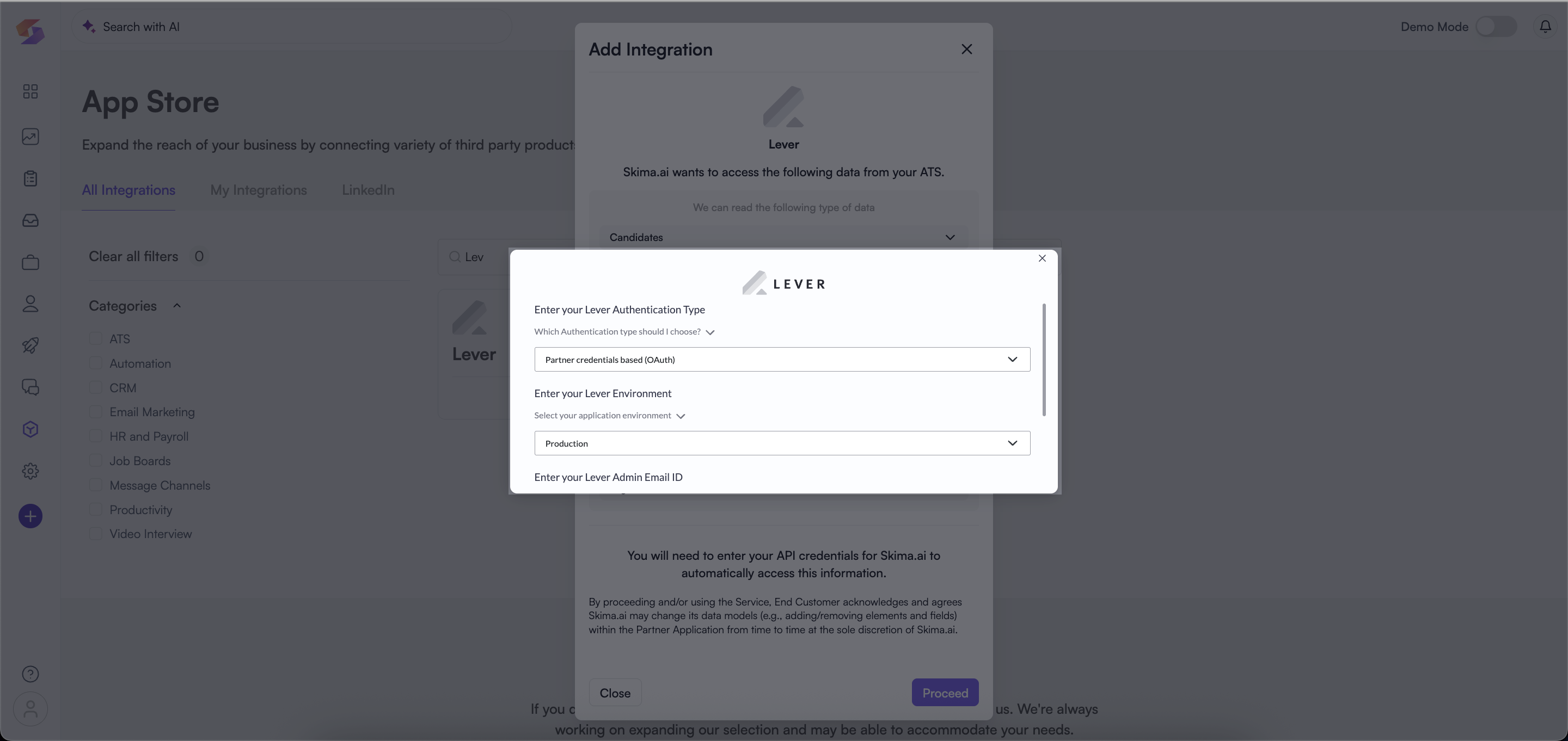 To integrate with your Lever account enter your Lever credentials, including: iii) Lever Admin Email ID